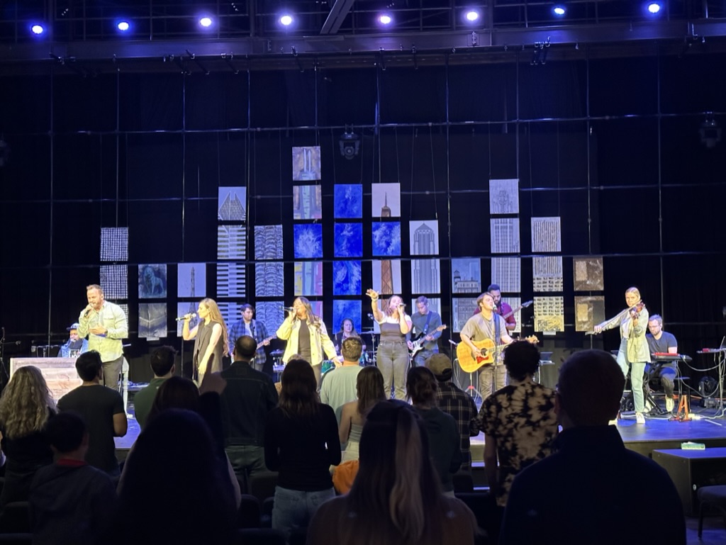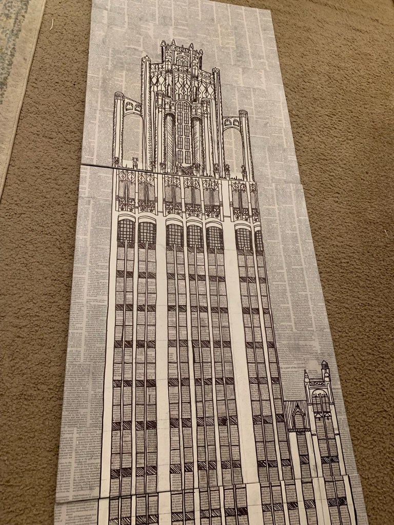 “Inked Tribune Tower on Tribune Paper” 16×80 (on 4 canvases) for Skyline Set